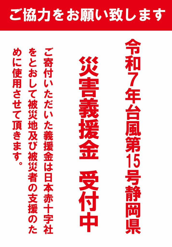 令和7年静岡県台風15号災害により被災された方々を支援するため、下記の通り義援金の受付を行います。