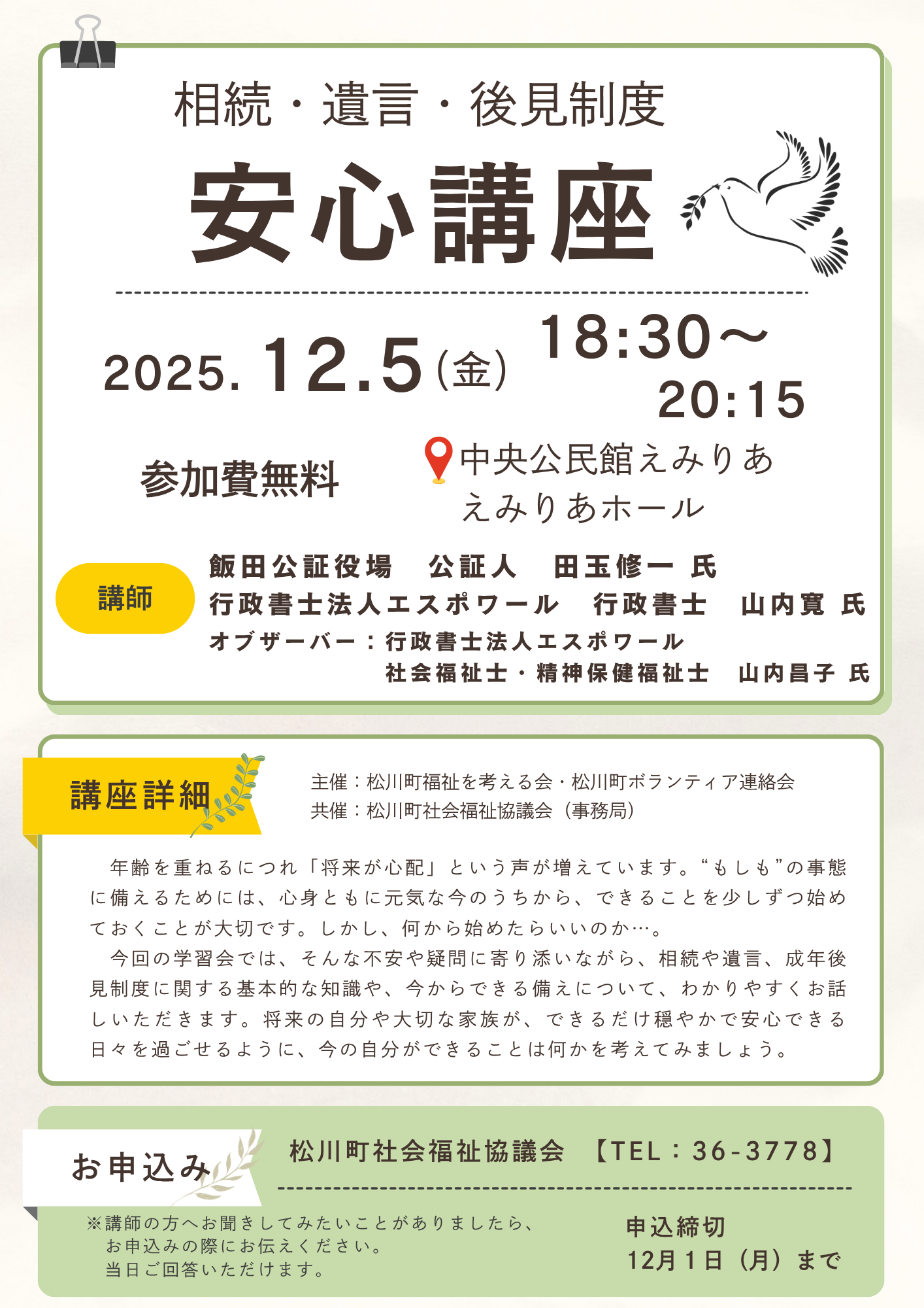 2025.11.06 お知らせ 相続・遺言・成年後見制度 安心講座のお知らせ 年齢を重ねるにつれ「将来が心配」という声が増えています。 “もしも”の事態に備えるためには、心身ともに元気な今のうちから、できることを少しずつ始めておくことが大切です。 将来の自分や家族のために、今の自分ができることは何かを考えてみましょう。 一覧を見る