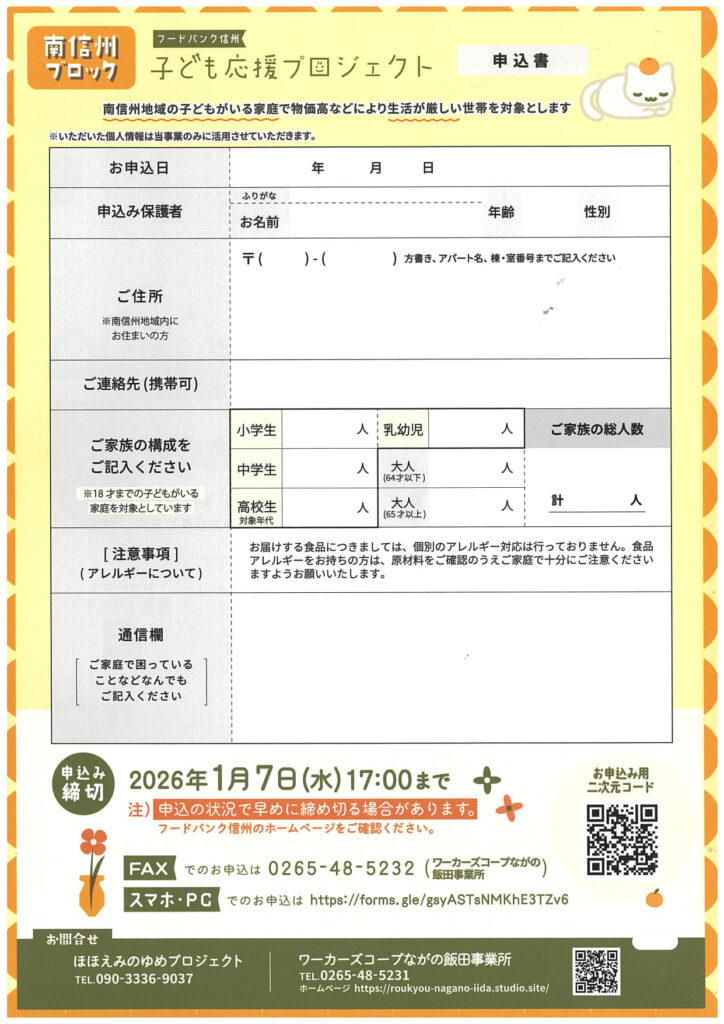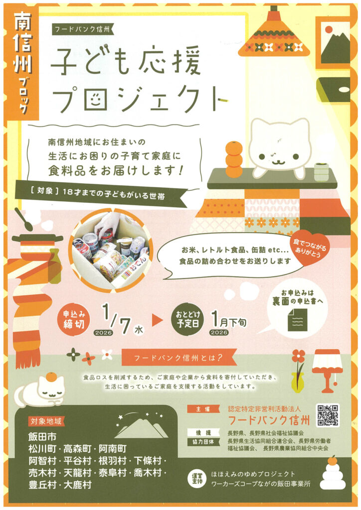 【対象者】南信州地域にお住まいの 18才までの子どもがいるご家庭 で、物価高などにより生活が厳しい世帯